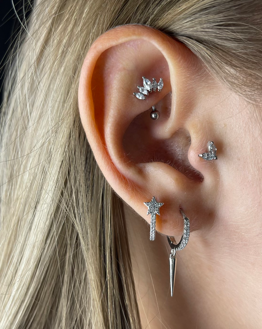 Le piercing hélix est situé sur la partie supérieur du cartilage de l'oreille. Les anneaux de 1,2x8mm et les piercings à boules ou plat de 1,2mm sont les piercings les mieux adaptés à cette zone.